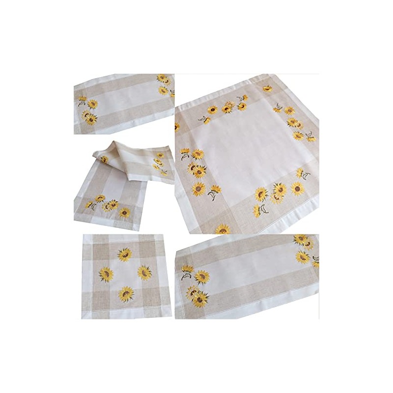 - Embroidered with yellow sun flowers on beige coloured background. The edge is decorated with a light brown wide stripe and neatly hemmed. A real autumn eye-catcher on any table.
