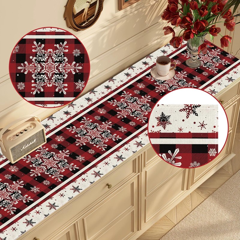 - CLASSIC HOLIDAY DESIGN Featuring a timeless red and black plaid pattern with a large white snowflake, accented by smaller snowflakes and dots, this Christmas table runner beautifully captures the essence of Christmas and winter, adding a cozy, festive atmosphere to your space.