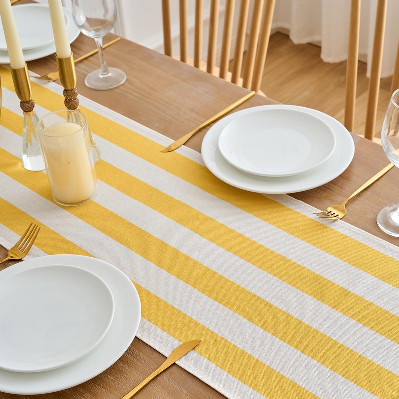 - Striped table runner: this table runner has a striped pattern in yellow, suitable for all kinds of tableware and minimalist decor with vibrant that does not fade and bleed. Goes well with tablecloths, placemats, napkins or other decorative table decorations.
