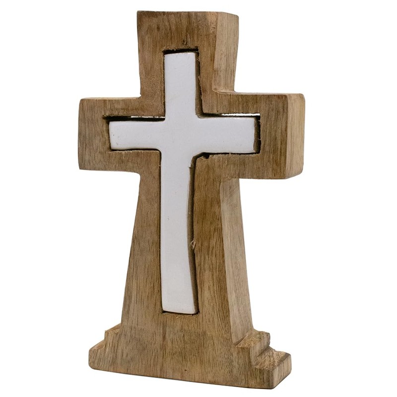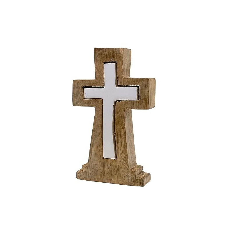 Table Top Wooden Cross with Puzzle Cut out | 6.5" Tall | Christian Home Decoration | Great Religious Gift for Baptism, First Communion, House Warming, and Weddings (Brown)