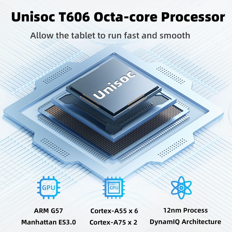 • High Performance - Aiprotablet tablet is powered by the UNISOC T606 octa-core processor, featuring an ARM Cortex-A75 high-performance CPU and a Mali-G57 GPU, ensuring smooth and efficient operation of most apps and seamless multitasking.