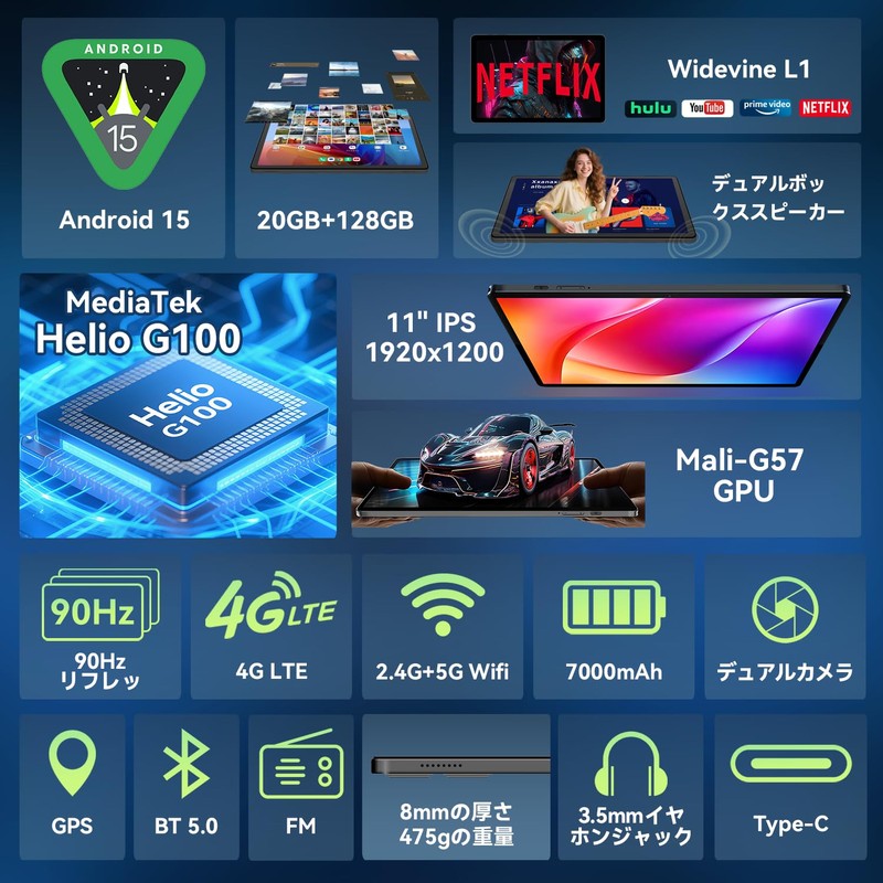 - [Equipped with MTK Helio G100, the tablet performance is dramatically! The Helio G100 processor uses the latest 6nm process technology for incredibly smooth operation from start-up apps to video playback and browsing the internet. The perfect balance between the high-performance 8-core CPU and the energy-saving design allows you to enjoy the battery without worrying about the battery even after long periods of use. The new gaming experience is also renewed, and HyperEngine 3.0 gaming technology allows you to play popular games at high frame rate and comfortably. It is stress-free to use multiple apps at the same time or switch between tasks. It can be used for everything from SNS checking to watching videos, to work. Supports full HD + 90Hz display and allows you to play high-quality content beautifully and maintain stable and high-performance operation for a long time