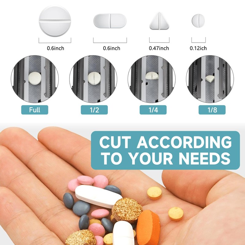 - Easy to cut: this tablet splitter is very easy to use. Simply place the pills on the guide and press the pill cutter. Sharp blades for a precise cut. You can precisely cut the tablets into 1/2, 1/4 or 1/8 to make them easier to swallow.