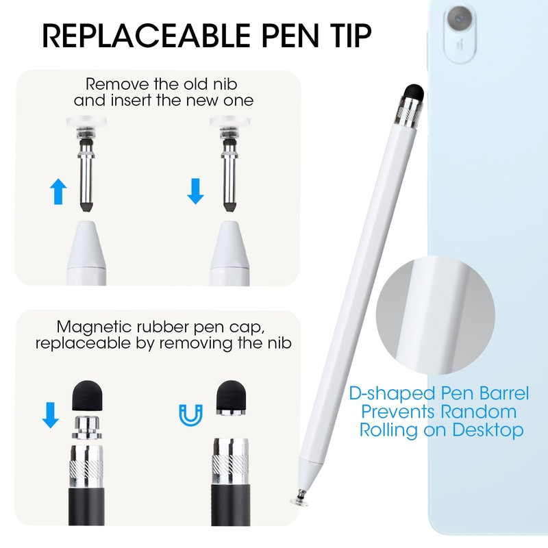 Tablet-Stift mit Dual-Tip für Alle Tablets, Universeller Stylus Pen Kompatibel mit Tablets/Handys/Smartphones, Präzisionsspitze, Kein Aufladen nötig, Magnetische Befestigung (Weiß/Schwarz)