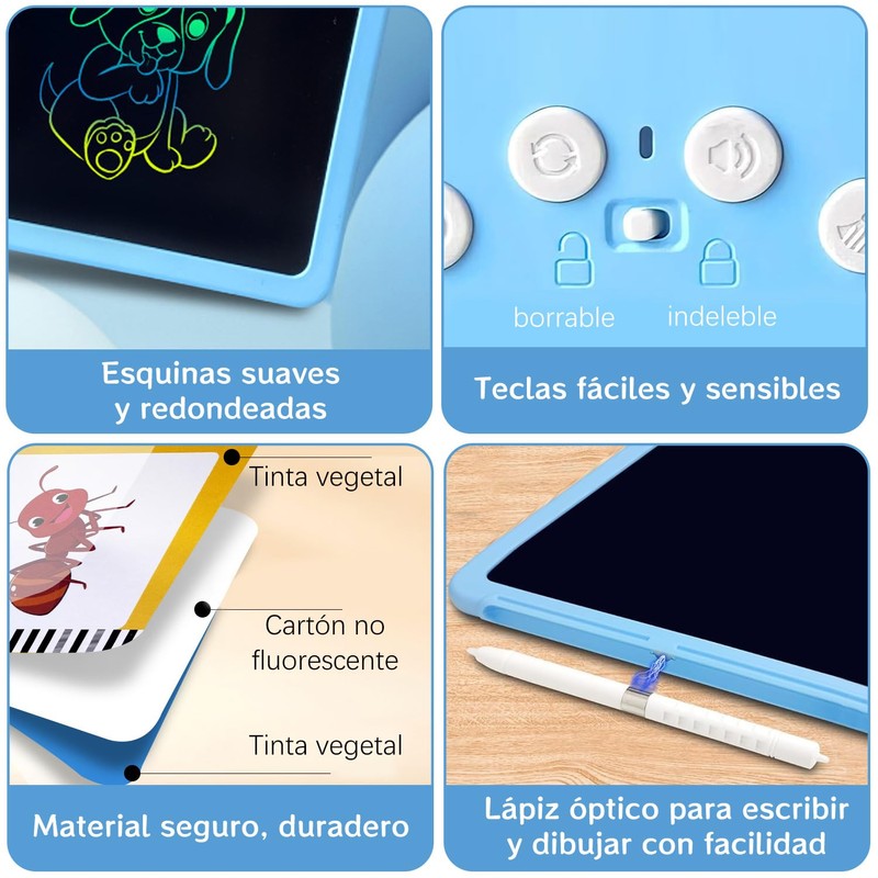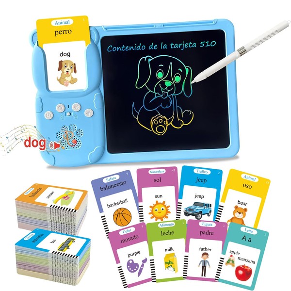 Tableta de Escritura LCD con Tarjetas Flash Parlantes, Lectura Bilingüe en Español e Inglés, Juguetes Didacticos Pizarra Mágica a Color, Montessori Juguetes Regalo para Niños de 3 4 5 6 7 Años (Azul)