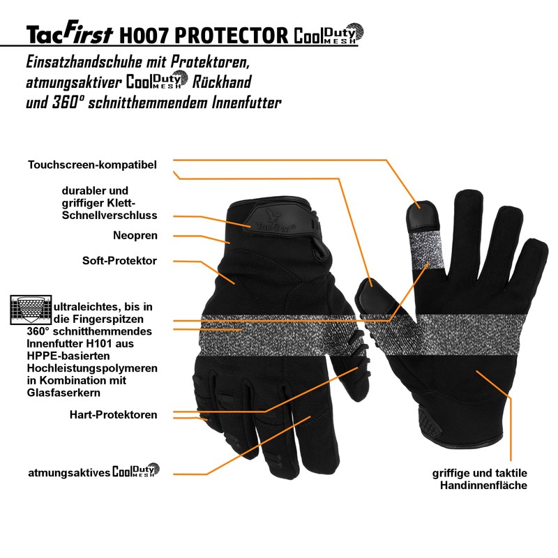 - Touchscreen compatible: Thumb and index finger of the TacFirst H007 Protector CoolDuty gloves are equipped with a touchscreen-compatible material, police touchscreen gloves, easy and reliable operation of touch displays, also suitable as touchscreen gloves for motorcyclists