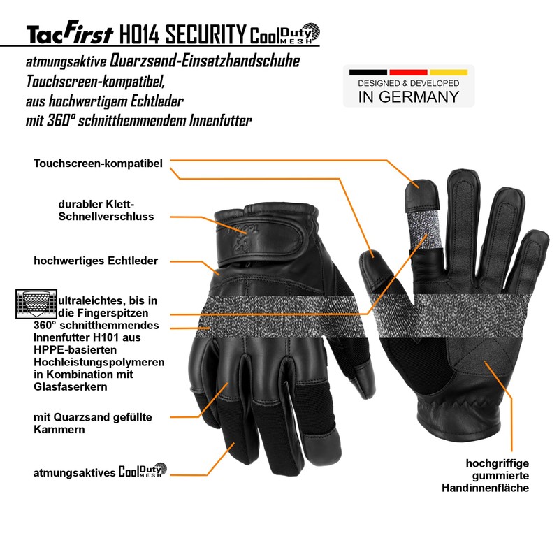 - Touchscreen compatible: Thumb and index finger of the TacFirst H014 Security CoolDuty gloves are equipped with a touchscreen-compatible material, security touchscreen gloves, easy and reliable operation of touch displays, also suitable as touchscreen gloves for motorcyclists