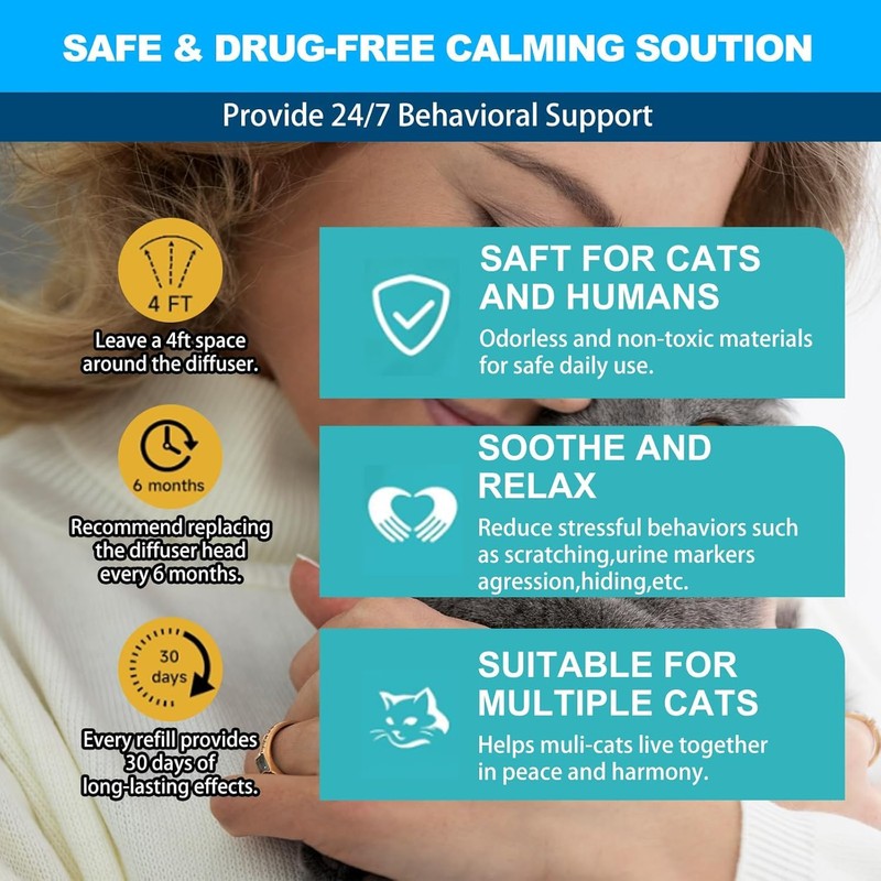 • Cat Calming Diffuser: This cat pheromones diffuser kit use newly upgraded diffusion technology to bring effective calming pheromones to cats and relieve stress. This is a simple and effective cat pheromone solution to make your cat happier and more relaxed