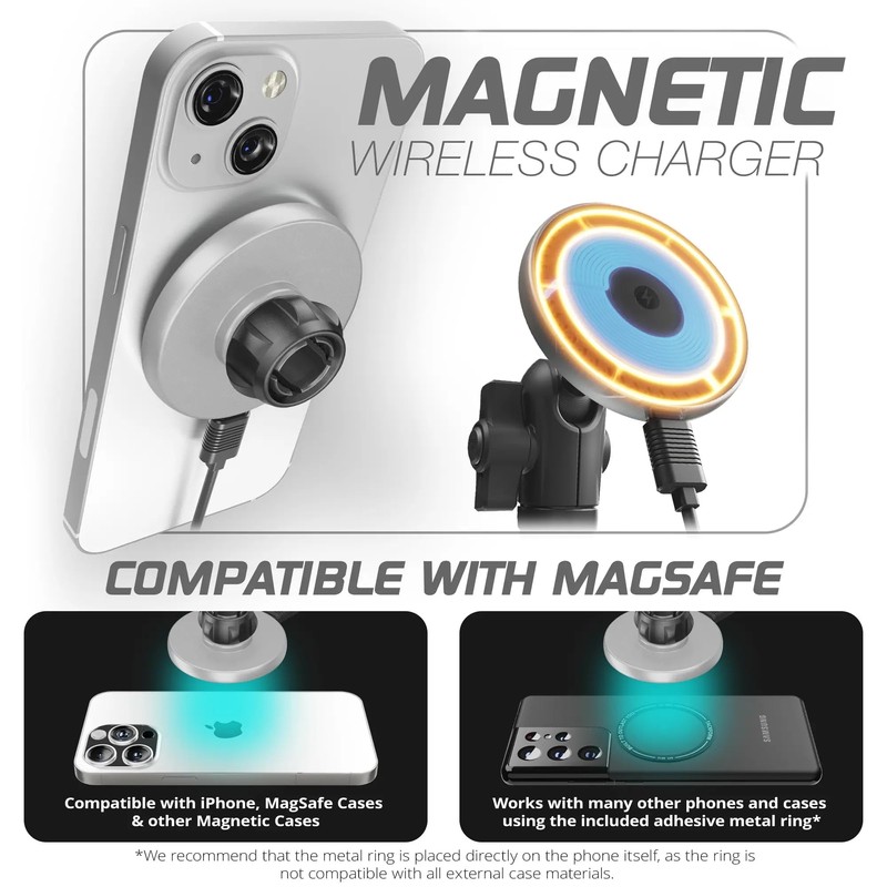 - COMPATIBLE WITH MAGSAFE AND BEYOND: Whether you have the latest device or a phone case compatible with MagSafe, our newly designed wireless charging magnetic phone mount offers an ultra-secure, convenient attachment solution that is both no-slip and non-marring. For devices that aren’t compatible with MagSafe, we've included a sleek adhesive metal ring, allowing you to enjoy the same reliable magnetic hold with all the benefits of wireless charging.