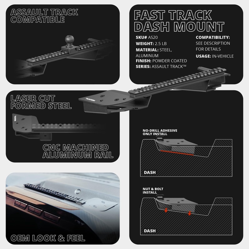 - NO DRILLING REQUIRED: Many of our competitors dash bracket offerings require you to drill into your dash or make modifications to secure them properly. Our Assault Track dash bracket is designed to provide a rock-solid hold on even the roughest terrains, using only 3M tape. No drilling is required! An added benefit of our no-drill system is that the mount can be easily removed, even after years of use, without damaging your dash.