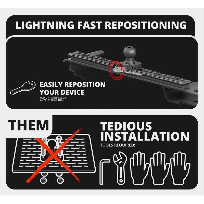- LIGHTNING FAST REPOSITIONING: While 'grid-style' dash mounts are trendy, they can be a nightmare when trying to install, move, or reposition your mounting bases. With our intuitive Assault Track system, you’ll never have to fumble with nuts again. Capable of comfortably holding up to four devices, the Assault Track system features a CNC-machined billet aluminum picatinny rail, allowing you to quickly add, remove, or reposition your mounts in seconds with nothing more than a house key.