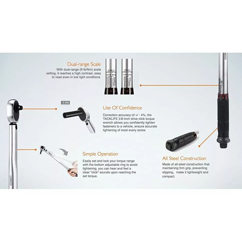 TACKLIFE 3/8-Inch Drive Click Torque Wrench 10-80 ft.-lb. / 13.6-108.5 Nm.-HTW1A