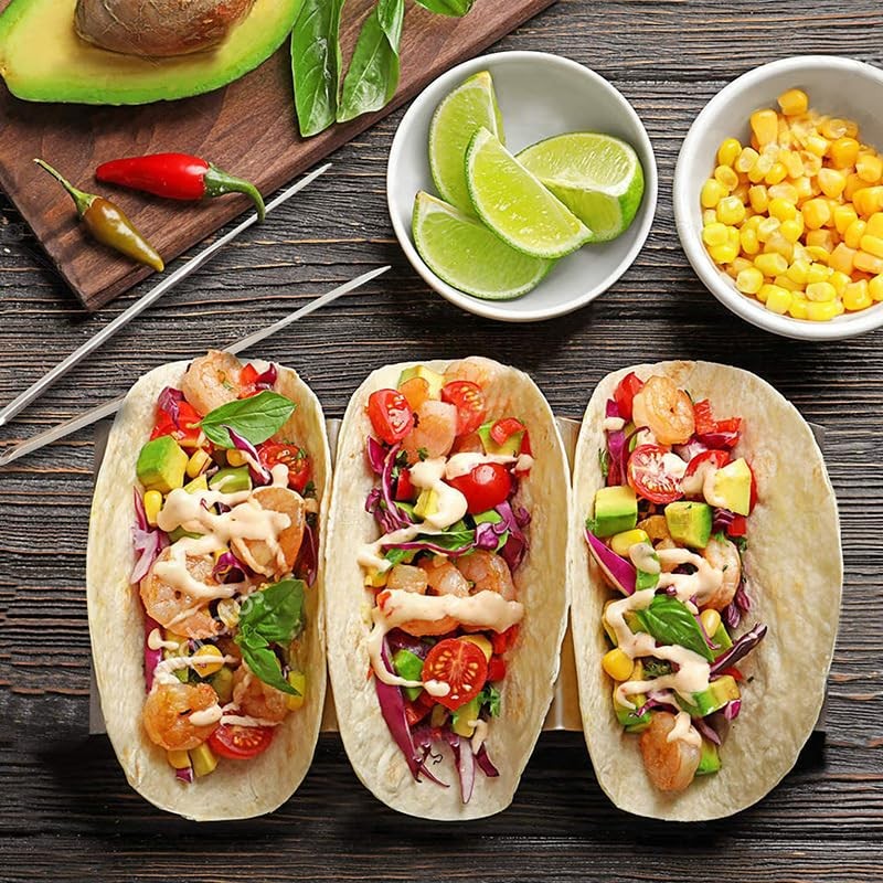 - 【Perfekt für Taco Halter】Mit Maßen von 25x12x4 cm bietet das Tablett des Halters genau die richtige Größe, um 4 Tacos, Hotdogs oder ähnliche Artikel bequem zu platzieren. Die Taco Schalen helfen nicht nur bei der einfachen Zubereitung, dem Servieren und dem Verzehr der Tacos, sie sind auch hitzefest. Benutzen Sie sie, um ihre Tacos im Ofen oder Grill zu backen