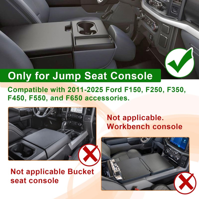 • Suitable for multiple years models: 2011-2024 2025 F150 F250 F350 F450 F550 F650 --- ONLY for jump seat console, NOT for bucket seat console and the console with work surface.