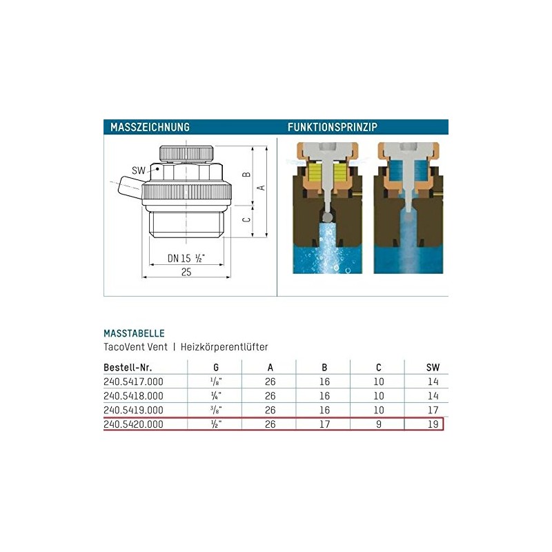 TacoVent 240.5420.000 Automatic Radiator Bleed Valve 1/2 Inch Self-Sealing