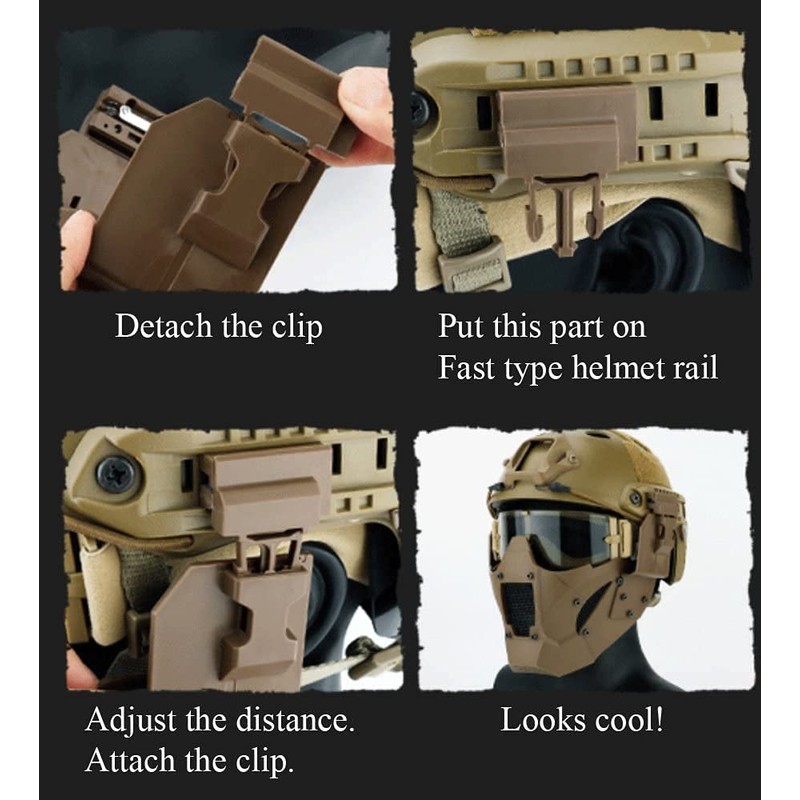 - Features: at least 700 FPS, impact resistance, comfortable padding, adjustable, lightweight, breathable Compatible with most eye protection goggles. The package includes side clips for mounting various FAST style helmets. Simply remove the shoulder straps and install the side clips, then place the mask on the helmet rail.