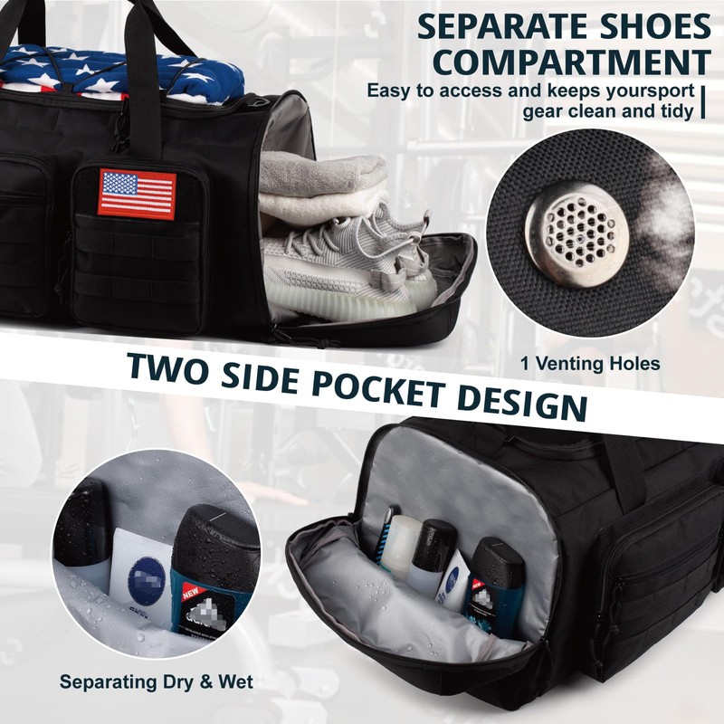 - 【Large Multiple Pockets Gym Bag】Featuring a spacious main compartment and 2 large inner mesh pockets, Travel duffel backpack also includes a dedicated shoe compartment and wet pocket on each side. The front showcases 3 pockets with webbing and a flag patch, while the back has a convenient luggage sleeve pocket. With an adjustable top lanyard, two long haul handles, a grab handle, and a removable shoulder strap, you can carry this bag in multiple comfortable ways.