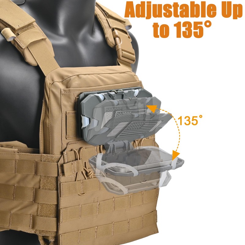- [Molle Easily Attaches]: It easily mounts the strap to your chest rig,airsoft vest,paintball vest or your tactical plate carrier vest by using 4 columns of Molle slots.Opening the buckle and pull the silicone strap back to quickly attach the phone within 30s