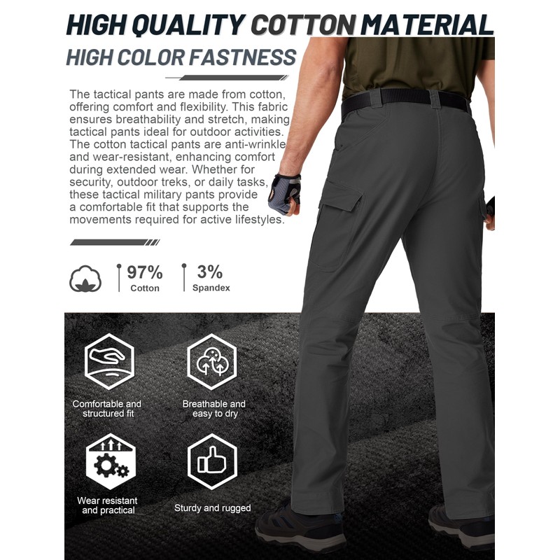 - Comfortable & Custom Fit: The tactical pants are made from cotton, offering comfort and flexibility. This fabric ensures breathability and stretch, making tactical pants ideal for outdoor activities. The cotton tactical pants are anti-wrinkle and wear-resistant, enhancing comfort during extended wear. Whether for security, outdoor treks, or daily tasks, these tactical military pants provide a comfortable fit that supports the movements required for active lifestyles.