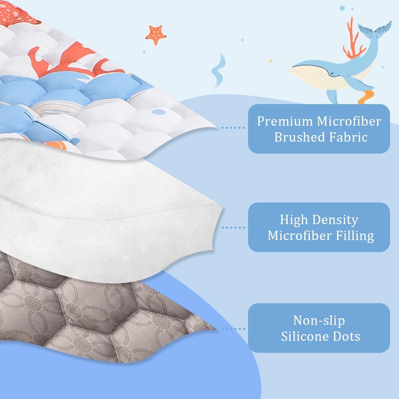 - PREMIUM SOFT MATERIAL - Our baby play mat features soft microfiber fabric with brushed surface for luxurious comfort. The thick cotton filling provides cloud-like cushioning for your little one's delicate skin, creating a cozy space for tummy time, crawling, and play