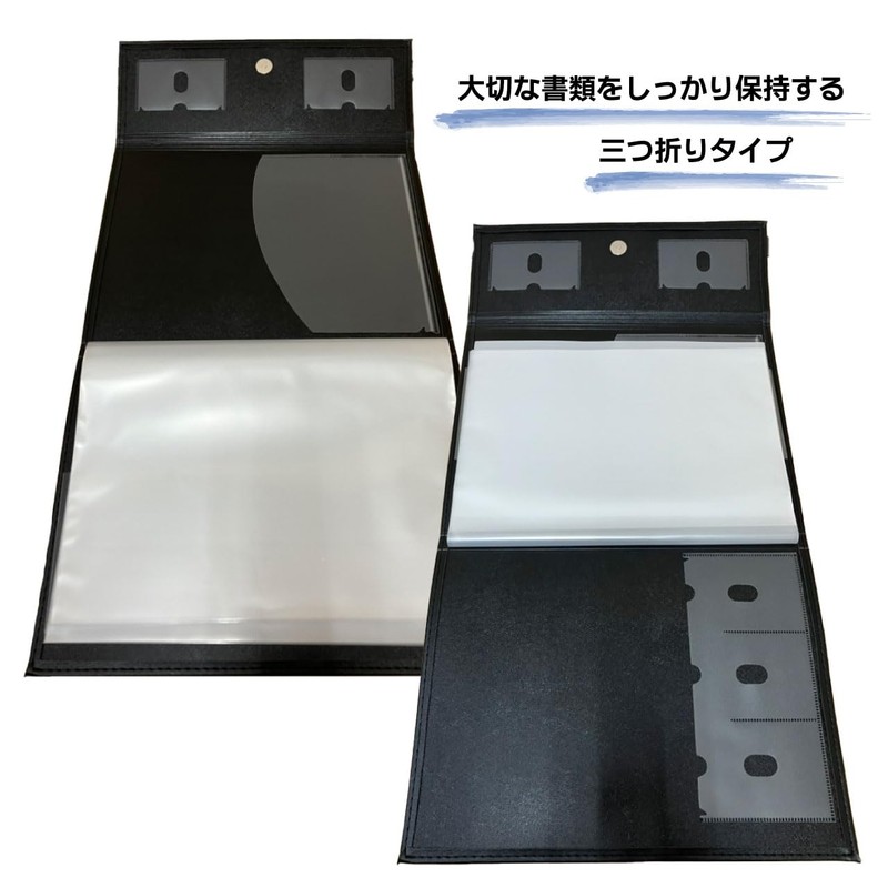 Standard: A4 format / 3 fold type; Outer dimensions: 9.4 x 12.8 inches (240 x 325 mm); Thickness: 0.9 inches (23 mm); Cover = synthetic leather, core material/pocket = polypropylene; Store and store important property contracts, important documents, drawings, etc. A trifold type that securely holds your important documents.
