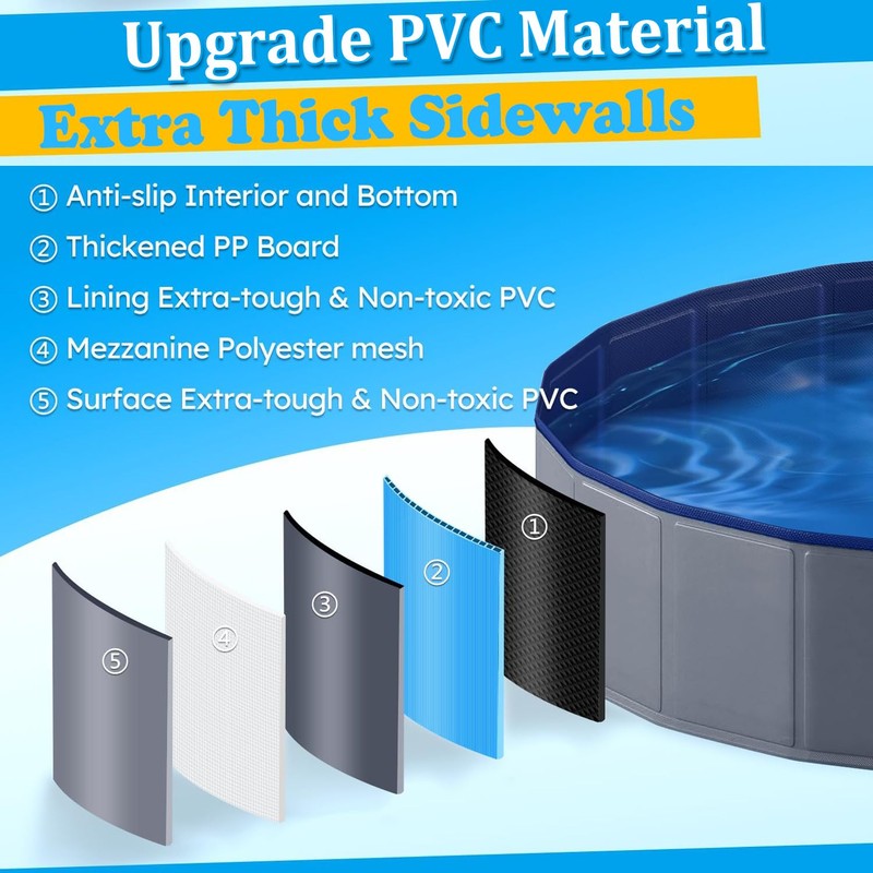 - ✔️ Sturdy Structure - Designed with a 0.2" thick high-density fiberboard, this collapsible dog pool maintains its shape even when empty. The UV-resistant classic color protects your pet’s eyes, while the reinforced walls provide stability for long-lasting use. The textured bottom prevents skidding, ensuring a safe and enjoyable bathing experience for your pet.