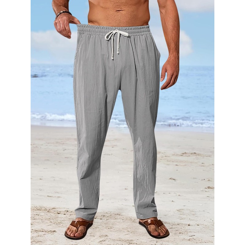TAFLE Mens Linen Pants Casual Summer Beach Pants Elastic Waist Drawstring Lightweight Vacation Trousers with Pockets Grey