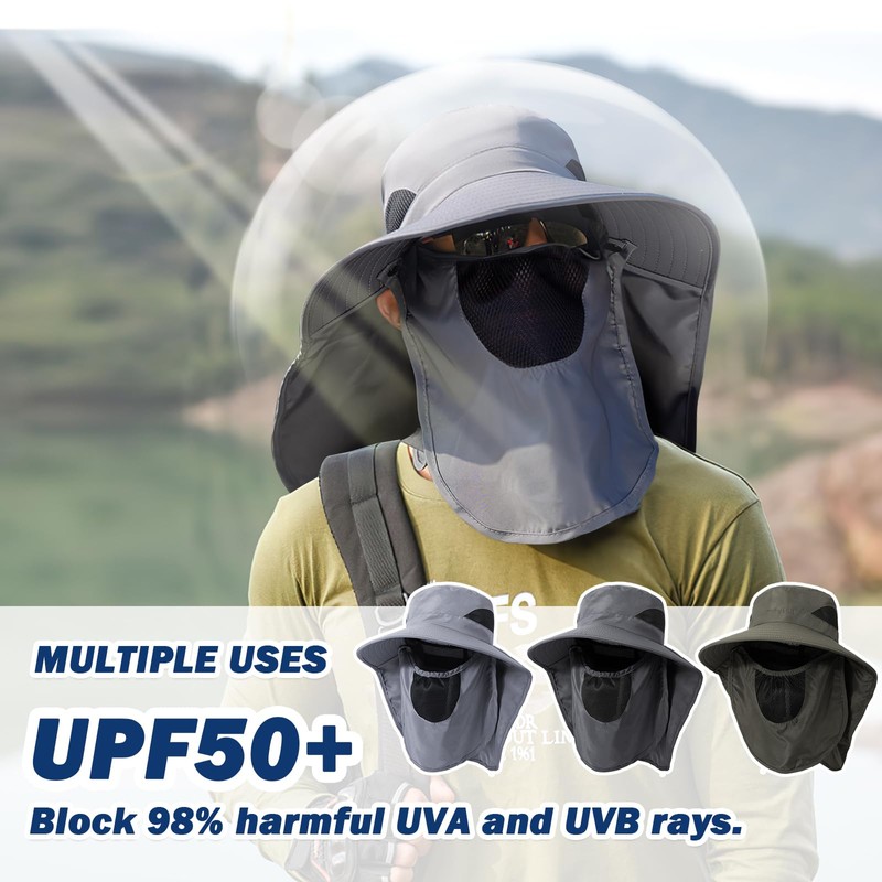 • 【Full protection and breathable】: Sun hat with UPF 50+, wide brim, face and neck flaps (removable face mask), keeps the sun away from head, face and neck. The moisture-wicking sweatband and mesh ventilation openings ensure cooling airflow in the hot summer and make the hat particularly breathable.