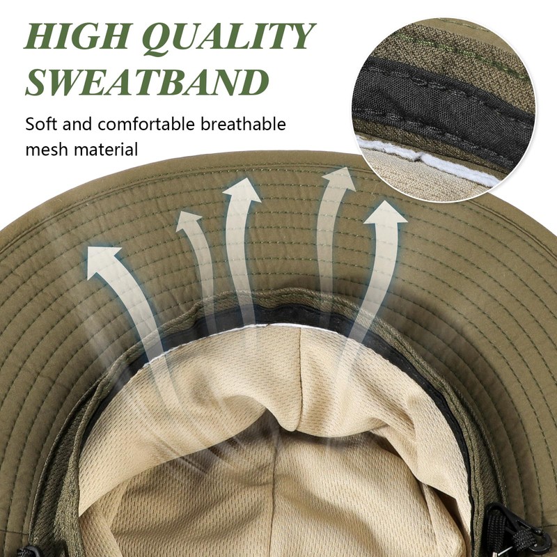 - ☀️【Eingebautes kühles, atmungsaktives Mesh】 Im Inneren des Sonnenhuts befindet sich eine Schicht aus weichem und atmungsaktivem Mesh-Gewebe, die vom oberen Teil des Sonnenhuts durch einen gewissen Abstand getrennt ist. Das weiche und kühle Material sorgt dafür, dass Sie sich aufgrund der Reibung zwischen Ihrem Kopf und dem atmungsaktiven Boonie Hat nicht unwohl fühlen.