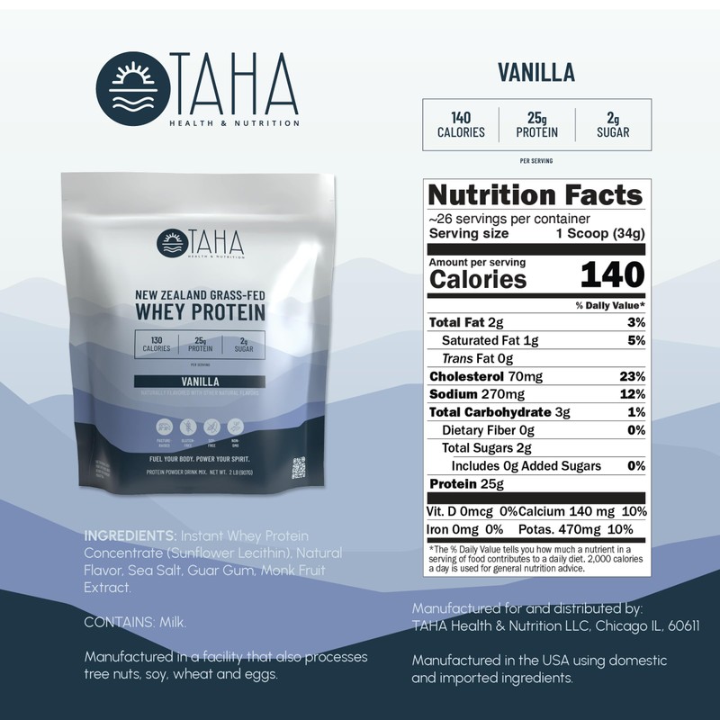 - 2 lbs of TAHA Health & Nutrition Vanilla Whey Protein Concentrate powder (26 servings). Enjoy as a pre or post-workout recovery shake mixed with water, milk, or juice, or even better add as a supplement to meals for an added protein hit.