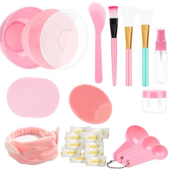 - El juego 24 en 1 viene con 1 tazón para mascarilla de silicona, 1 tazón para mezclar, 1 limpiador para la piel, 1 cinta para el cabello, 1 espátula en barra, 2 cepillos para mascarilla de silicona, 1 cepillo suave, 1 esponja facial, 3 cucharas medidoras, 1 botella con atomizador, 1 pequeño botella de remojo y mascarilla de compresión de 10 piezas.