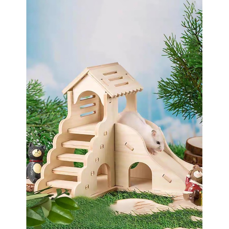 Taicols Wooden Hamster Maze Villa with Slide & Seesaw - Multi-Level Hamster Cage Accessories, Natural Chew-Proof Hamster House Hideout for Dwarf Hamsters, Gerbils(Hamster Toys & Decor)