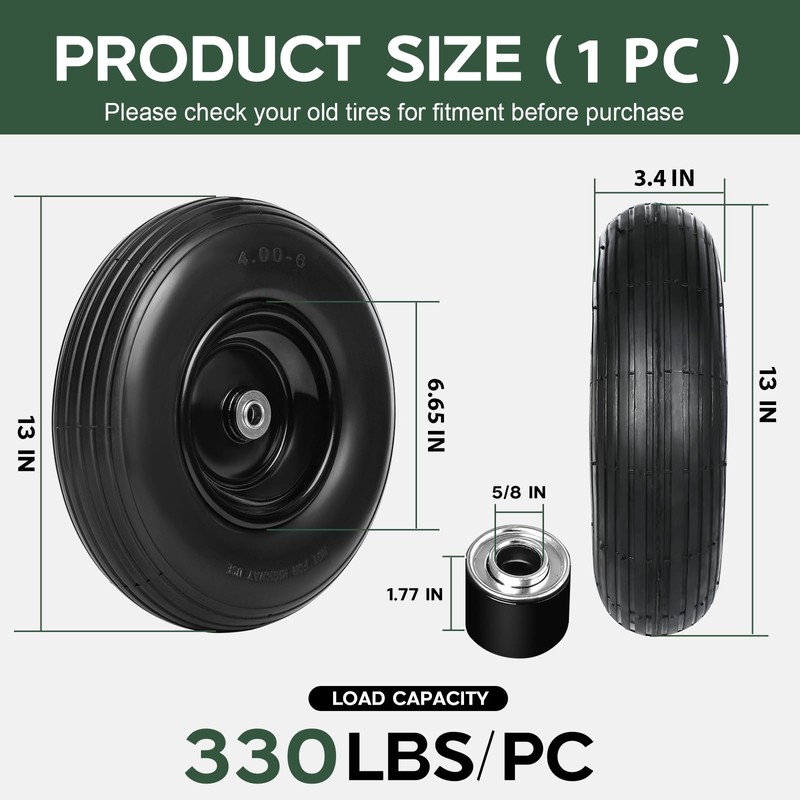 - Specifications & Applicable Models: 4.00-6 air less rubber tire and wheel Diameter of Wheel: 13', Iron hub dia.: 6.65', Width: 3.4' , Bearings: 5/8", Axle Bore Length: 1.77". Load capacity: 330 LBS/Wheel. Suitable for wheelbarrow, hand truck, trolley, boat dolly, garden utility wagon, garden scooter, hose reel cart,etc.
