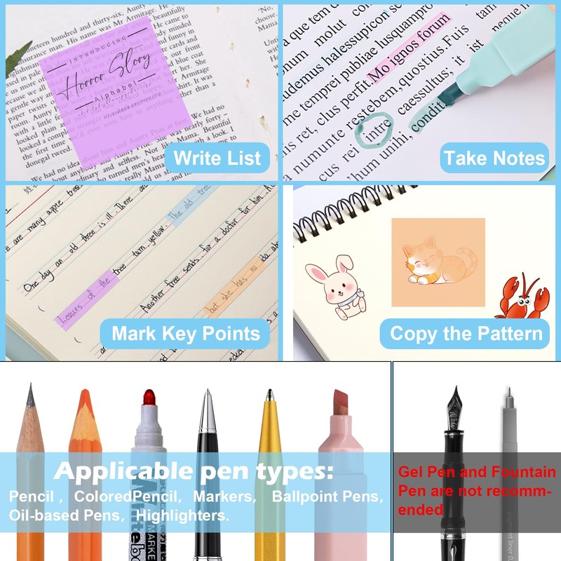 - 【Sticky Notes and Highlighters Set】The packaging contains 600 transparent sticky notes of different colors, shapes, and sizes, along with 6 dual-tip highlighters pastel in 6 different colors. The different color layers can highlight various information, allowing you to quickly find the notes you need, saving time, increasing work efficiency, and also enhancing aesthetics.