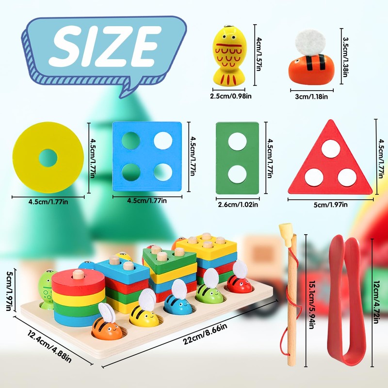 - Triple Montessori toy: Our Montessori toy from 1 year consists of 5 small fish (5 colours), 5 small bees (5 colours) and 16 wooden blocks with different shapes (4 shapes and 4 colours), and it is a combination of fishing game, bee clip game as well as sorting and stacking game that can give children many joys.
