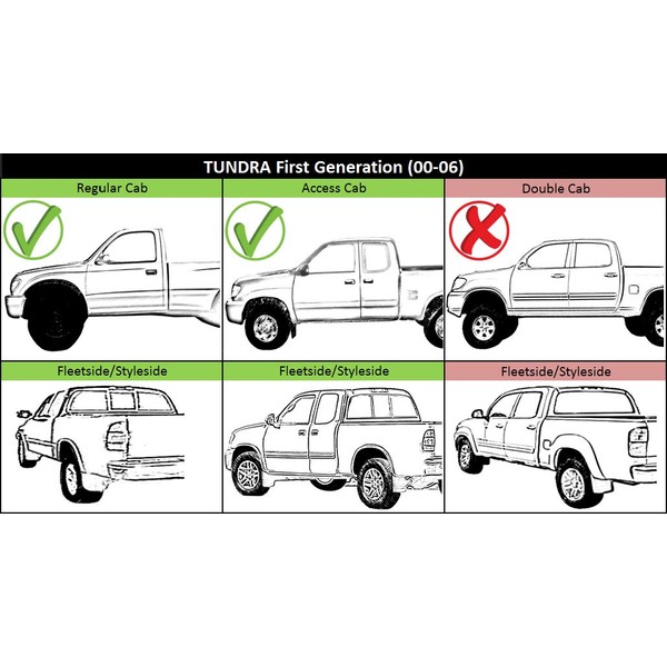 * 2005-2006 Tundra Base Fleetside (Standard Bed), 2-Door, Standard Cab Pickup (Regular Cab) * 2005 Tundra Base Fleetside (Standard Bed), 4-Door, Extended Cab Pickup (Access Cab) * 2005 Tundra Limited Fleetside (Standard Bed), 2-Door, Standard Cab Pickup (Regular Cab) * 2005-2006 Tundra Limited Fleetside (Standard Bed), 4-Door, Extended Cab Pickup (Access Cab) * 2005 Tundra SR5 Fleetside (Standard Bed), 2-Door, Standard Cab Pickup (Regular Cab) * 2005-2006 Tundra SR5 Fleetside (Standard Bed), 4-Door, Extended Cab Pickup (Access Cab)