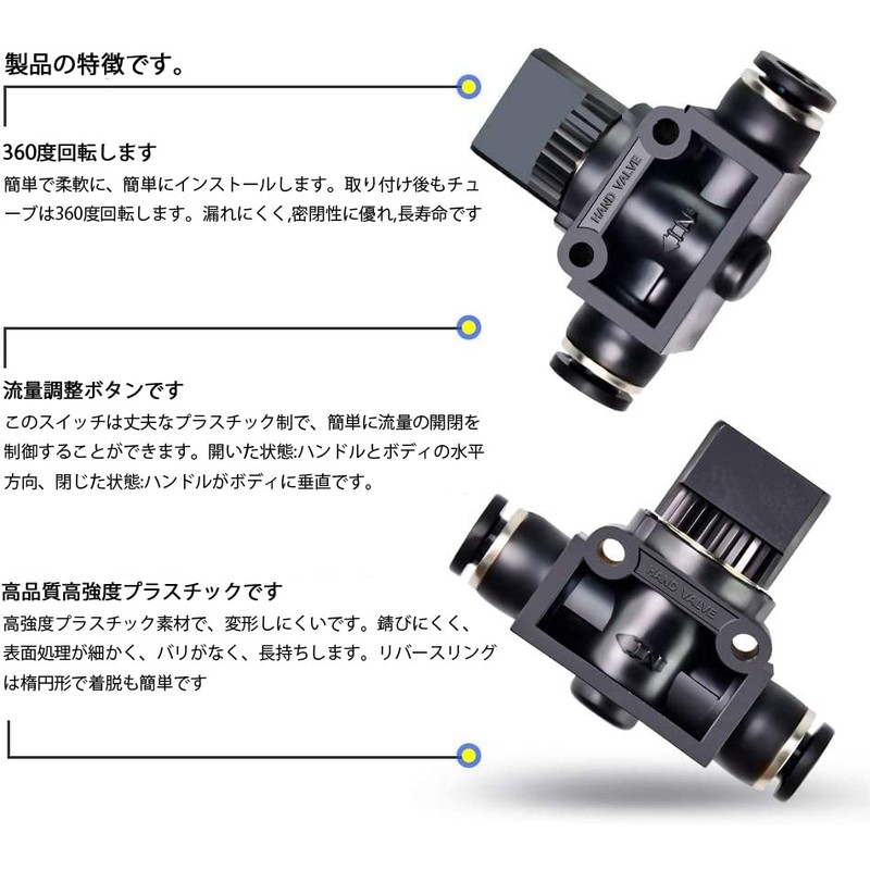 1 Rotation Control Switch < br > 2 The product is strong, durable and long service life. < br > 3 Easy to assemble. < br > 4 Can be used for pipe connection and fluctuating units, and can be used for a wide range of applications. < br > < br> < b >★ Please note: < / b > < br > < br > 1 Do not use on water pipe parts. < br > 2 Do not place near fire. < br > 3 Do not exceed the operating pressure of 150 psi. < br > 4 Avoid prolonged contact with acidic substances. < br > 5 Do not use any accessories with additional external load (bending, twisting, or pull). < br > 6 Please avoid inappropriate materials (strong oxidant, acid, alkali, etc.) < br > 7 Do not store in humid areas.