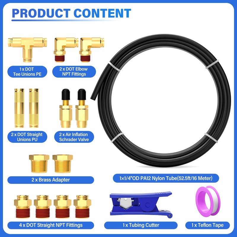 - 【Package Included】1 ×1/4" Air Tubing, 4 × Straight DOT 1/4" OD x 1/4" NPT Thread, 2 ×Elbow DOT 1/4" OD x 1/4" NPT Thread , 2×1/4" Air Inflation Schrader Valve, 1×1/4"OD DOT Tee, 2 × Straight DOT 1/4" OD, 2×1/2" NPT Male x 1/4" NPT Female Brass Adapter,1× Teflon Tape,1× Tracheal Scissors
