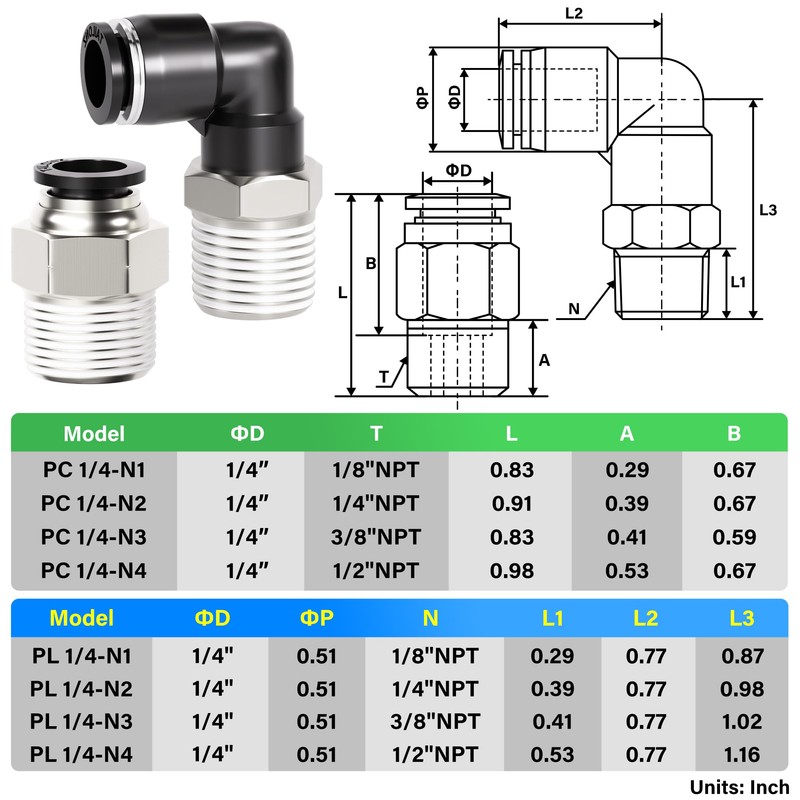 TAILONZ PNEUMATIC TAILONZ PNEUMATIC Elbow and Straight Combination 1/4 Inch Tube OD x 3/8 Inch NPT Thread Push to Connect Fittings PC-1/4-N3+PL-1/4-N3(Pack of 4)