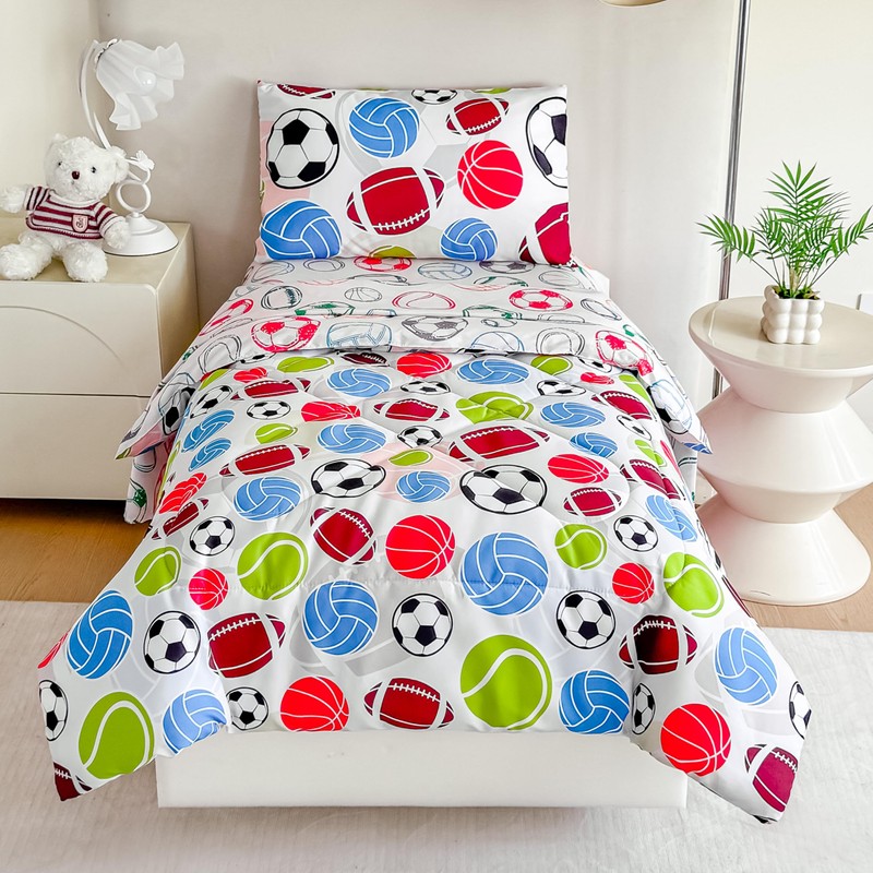 Tailor Shop 4 Pieces Toddler Bedding for Boys Toddler Basketball Football Baseball Comforter Includes Quilted Comforter Fitted Sheet Top Sheet and Pillow Case