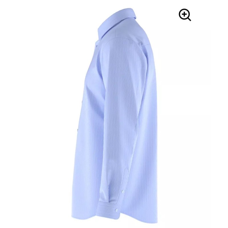 This is a men's dress shirt by the brand Tailored 4U, featuring a blue and white lined pattern and a collared neckline with a button closure. Made of 82% nylon and 18% spandex, the shirt has a four-way stretch fabric wash for a comfortable and breathable fit. With long sleeves and a spread collar style, this dress shirt is suitable for various occasions such as travel, weddings, parties, workwear, and more. Available in size large and machine washable for easy care.