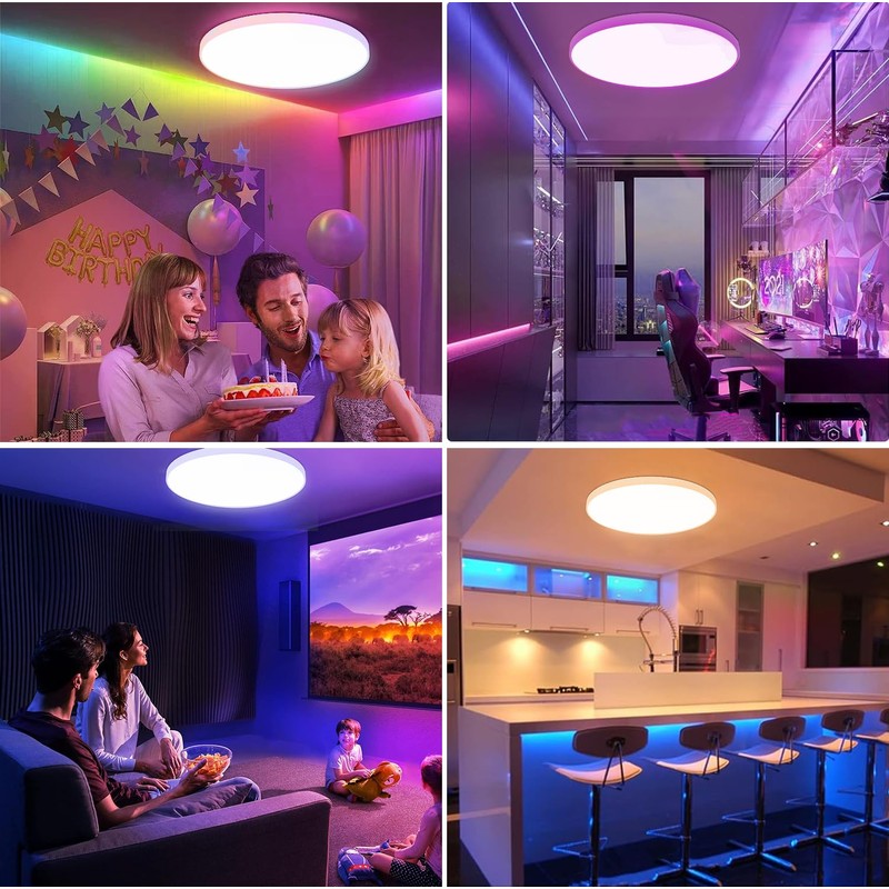 - đăFeature Upgradeă This smart ceiling lighting can be controlled by APP for multiple functions, such as: 16 million colors switch, brightness dimmable, color temperature 2700-6500k adjustment, timing function, music mode, sunrise / sunset mode, variety of scene modes, lighting schedule, cloud control, etc. And works with Alexa, Google Home Assistant, IFTTT.