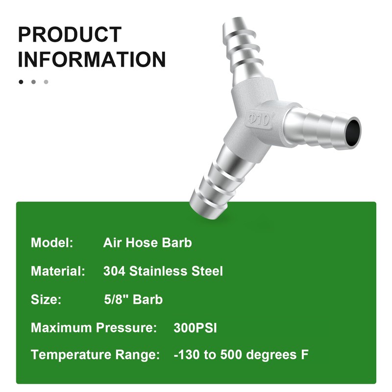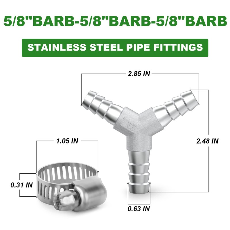 TAISHER - 2 piezas de acero inoxidable 304 de 5/8 x 5/8 pulgadas x 5/8 pulgadas, empalmador de juntas en forma de Y de 3 vías para combustible, aire/lquid/gas con 6 abrazaderas de manguera