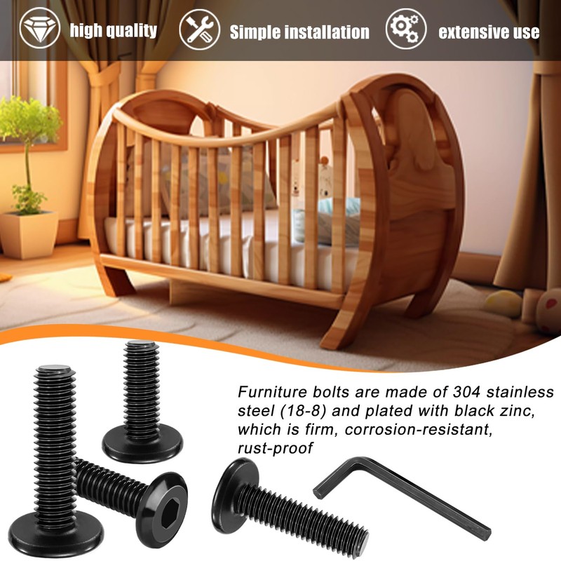 - Product material:Furniture bolts are made of 304 stainless steel (18-8) and plated with black zinc, which is firm, corrosion-resistant, rust-proof, long in service life and not easy to be damaged.