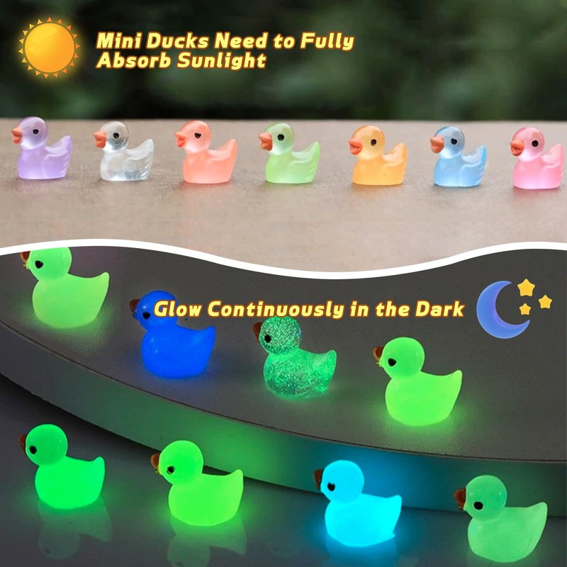 - Glow in the dark fun: these adorable mini ducks glow in the dark! They are ideal for creating magical night decorations or playing fun hide-and-seek games. Watch them glow in your fairy garden, aquarium or party backdrop.