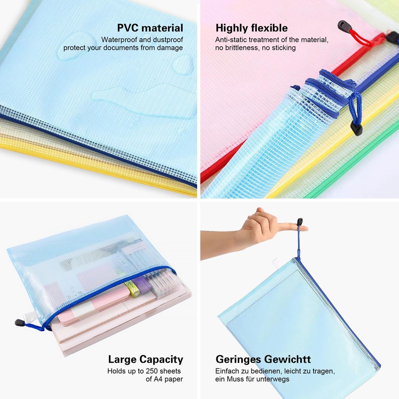 Taiyeestar Pack of 12 A4 Document Wallets, Colourful Waterproof Document Bag with Zip, File Zipper Bag, Mesh Plastic Zip Bag for Documents, Cosmetics, Travel Accessories