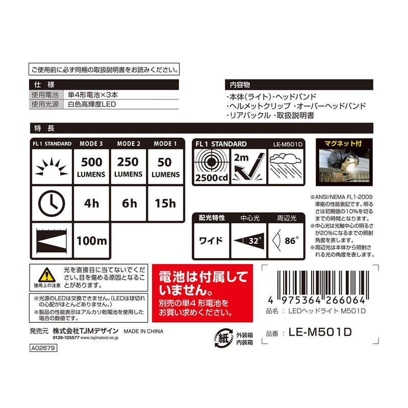 Tajima LE-M501D LED Headlight M501D Brightness Up to 500 Lumens