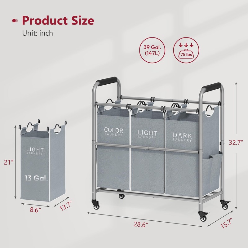 • 【Removable Laundry Bags】Each laundry bag can be taken out individually from the 3 part laundry sorter, just use the two metal handles to lift the laundry bag for easy access to the laundry room