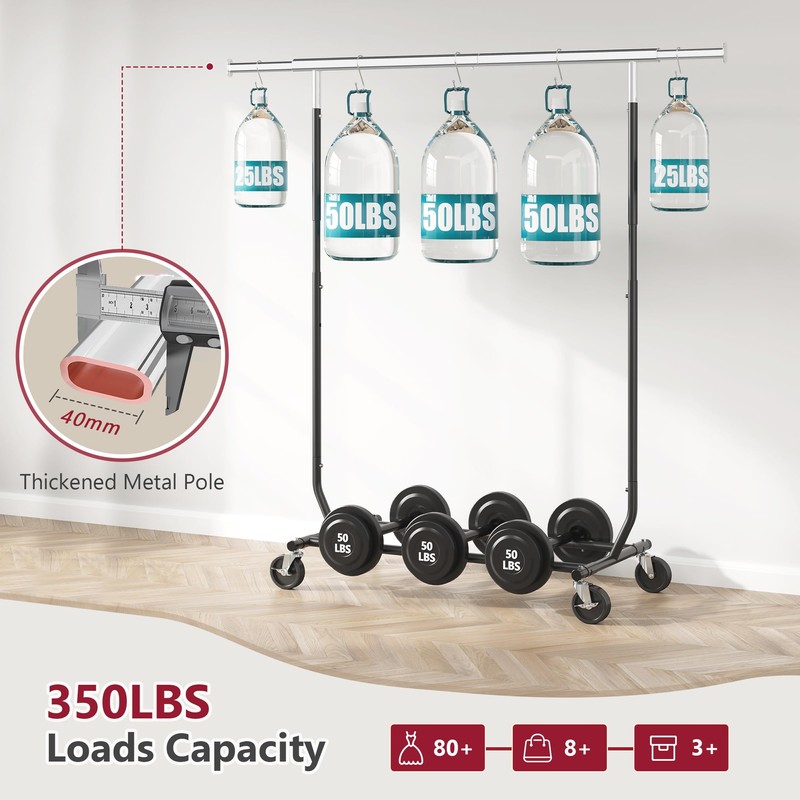- 【Heavy Duty & Sturdy】Freestanding clothes rack is made of heavy-duty steel tubing and can hold up to 350 lbs (200 lbs for the hanging rod and 150 lbs for the bottom shelf). The high quality thick rods are plated to make them waterproof, rustproof, corrosion resistant and scratch resistant and so on. It won't bend or wobble even with heavy clothes hanging, meeting your daily needs.