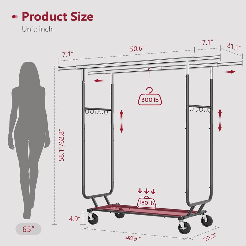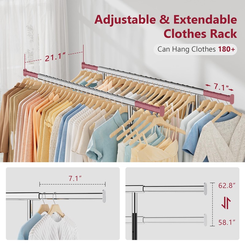 - Adjustable Clothing Rack: There are retractable rods on both sides of the hanging rod, the horizontal double rods can be extended from 50.6” to 64.9”, and the vertical height can be adjusted from 58” to 62.8”. You can adjust the length and height of the rod to meet your space needs. The 21” hanging rod spacing does not worry about the clothes in the two rows touching each other.